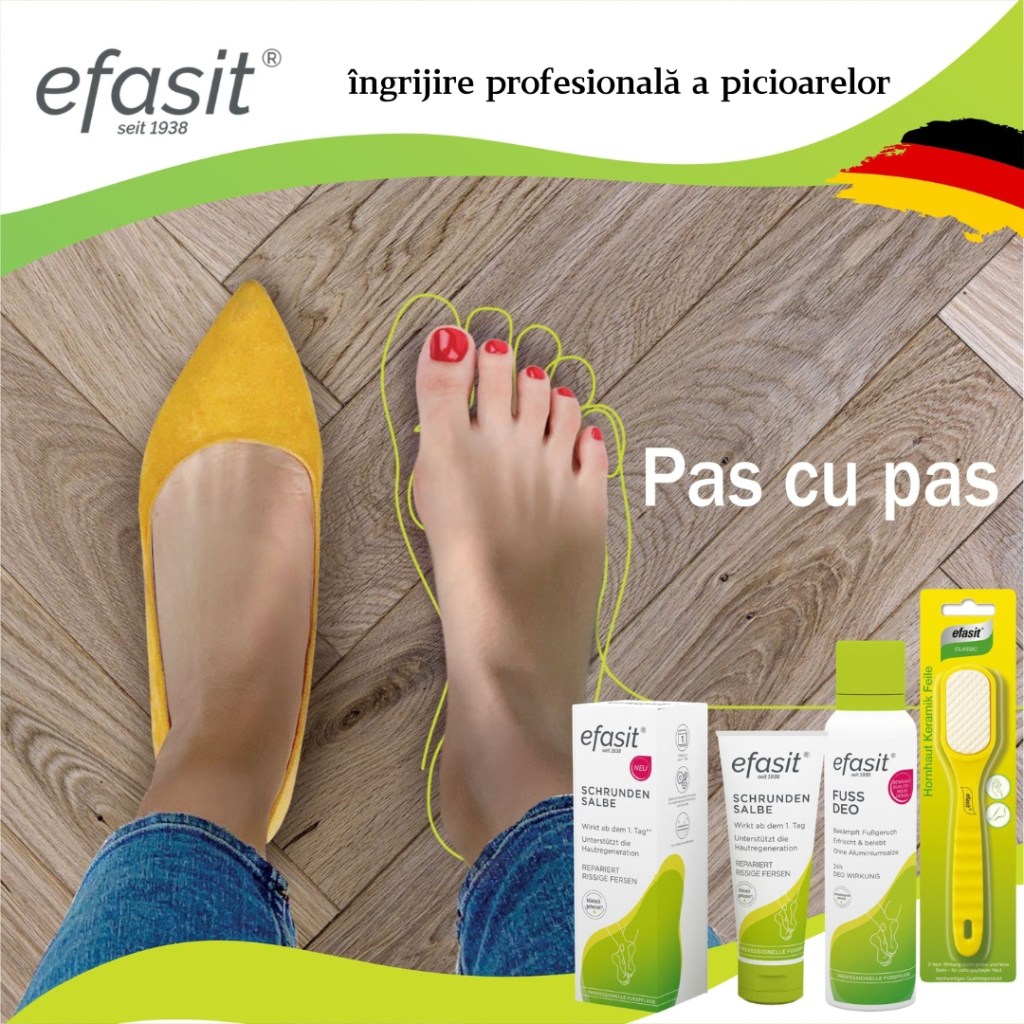 Efasit este o marcă germană cu tradiție în îngrijirea profesională a picioarelor, ce oferă soluții atât pentru îngrijirea de zi cu zi, cât și pentru diverse probleme care pot apărea, cum ar fi călcâiele crăpate, calusurile, pielea uscată, transpirația sau mirosul neplăcut. Printr-o gamă variantă de produse, ce include inclusiv pudra deo activă sau gelul răcoritor, minunate vara, Efasit are grijă să avem picioare frumoase, pas cu pas!