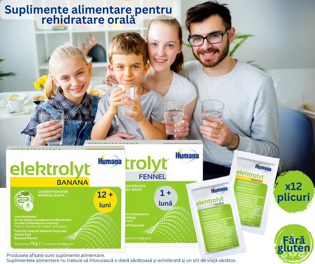 Iar dacă zilele acestea sunteți sau urmează să plecați în concediu, e bine știut că perioada de vară nu aduce numai soare și vacanță la mare în familie, ci poate aduce și cel puțin un episod de enterocolită, probabil cea mai des întâlnită afecțiune digestive, mai ales în cazul copiilor. Enterocolita duce la apariția diareei și a vărsăturilor, cele mai frecvente cauze ale deshidratării. Prin compoziția să, produsul Humana Elektrolyt compensează pierderea de săruri minerale și lichide, ajutând la atenuarea stării de deshidratare și la reechilibrarea hidroelectrolitică a corpului. Aceste săruri sunt disponibile în două variante, cu aromă de fenicul (potrivit începând cu vârstă de 1 lună) și cu aromă de banană (pentru copii cu vârstă peste 1 an și adulți) și se găsesc în majoritatea farmaciilor.