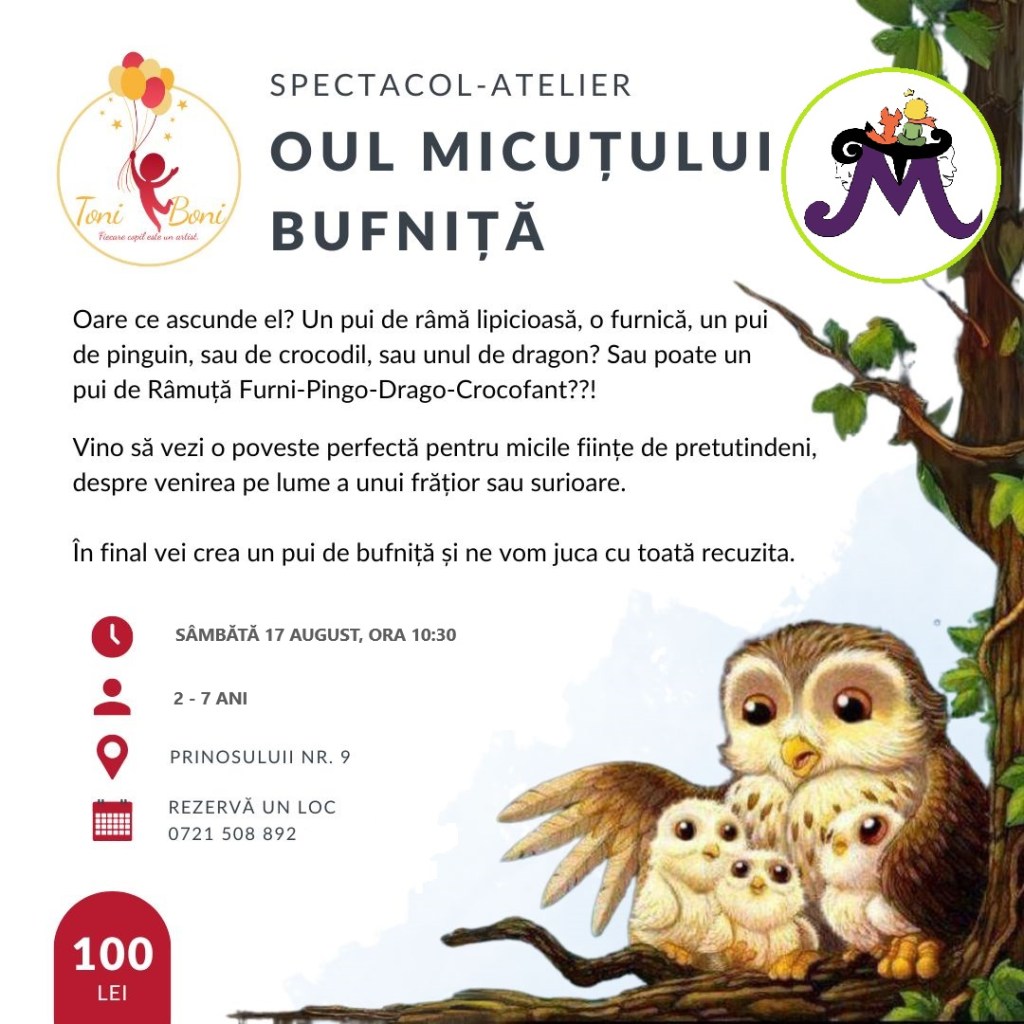 – Oul Micului Bufniță – spectacol-atelier cu Teatrul Mititel, la ToniBoni (zona Piaţa Sudului), 17 august, ora 10:30, 1-7 ani, 100 lei/copil+părinte