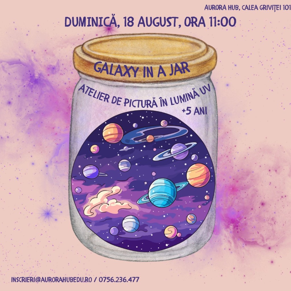 – Galaxy in a jar – atelier de pictură în lumină UV, la Aurora Hub (zona Victoriei), 18 august, ora 11, 5 ani+, 90 lei/copil – 20% reducere dacă spui #stiudelasorina
