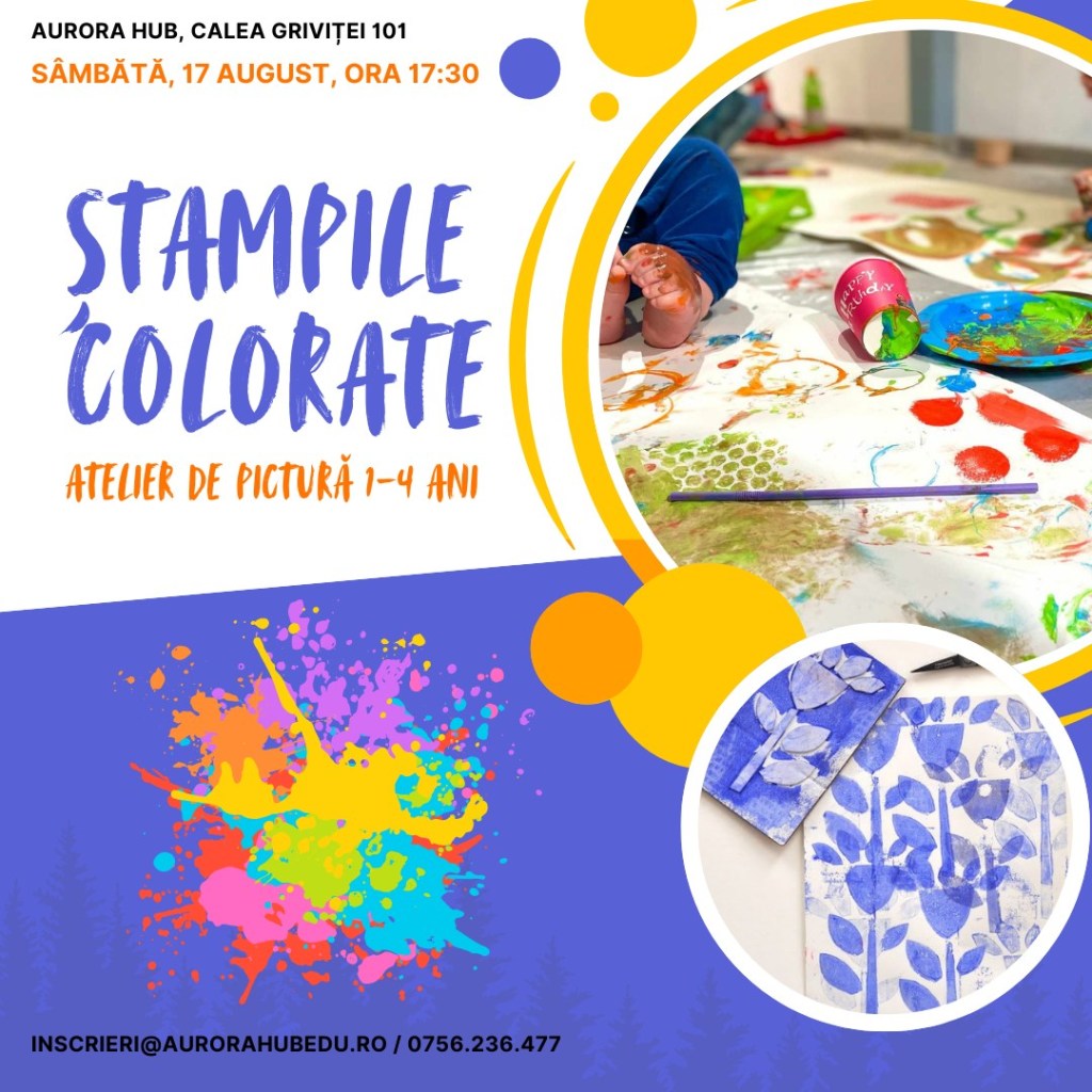 – Ștampile colorate – atelier de pictură, la Aurora Hub (zona Victoriei), 17 august, ora 17:30, 1-4 ani, 90 lei/copil – 20% reducere dacă spui #stiudelasorina