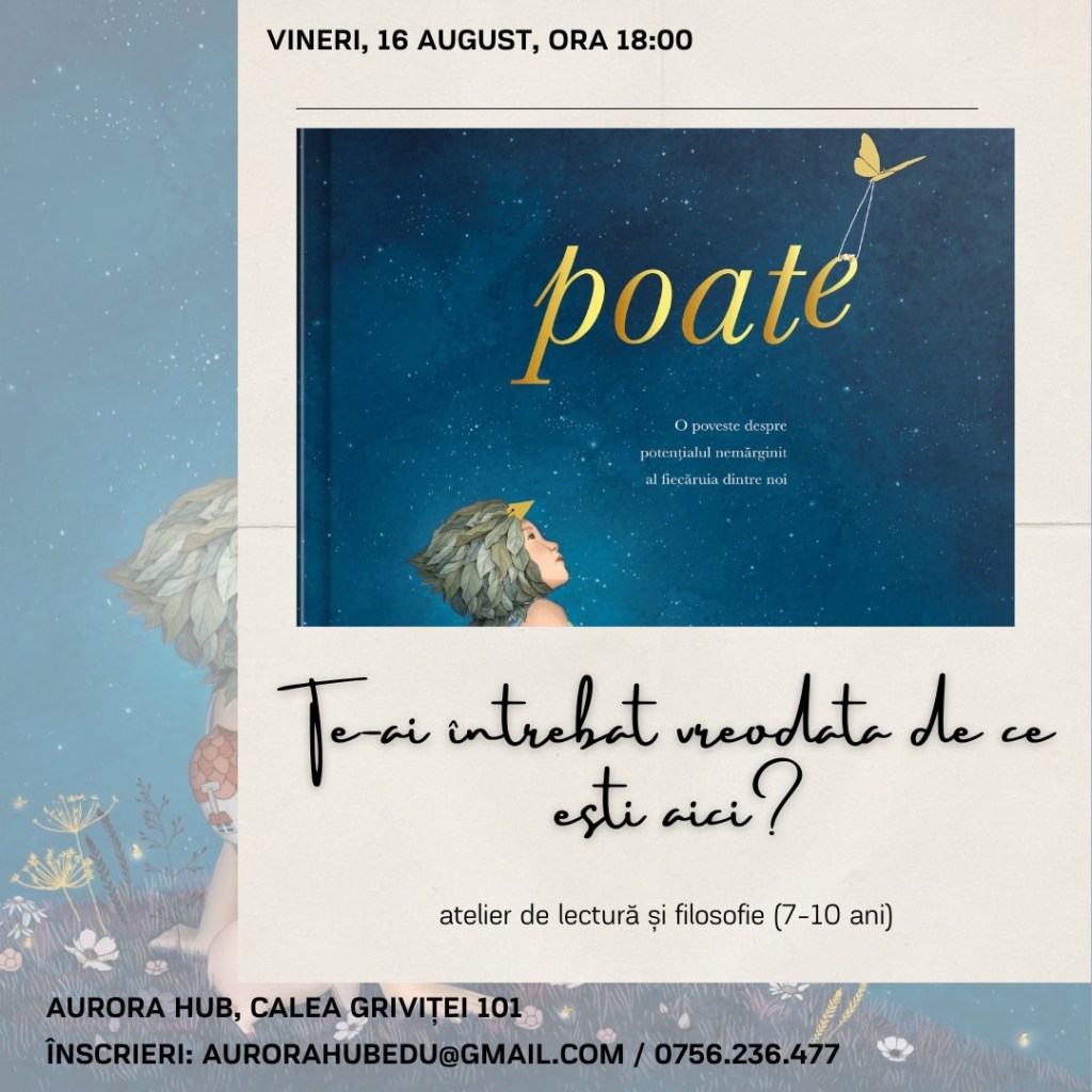 – Te-ai întrebat vreodată de ce ești aici? – atelier de lectură și filosofie, la Aurora Hub (zona Victoriei), 16 august, ora 18, 7-10 ani, 50 lei/copil – 20% reducere dacă spui #stiudelasorina
