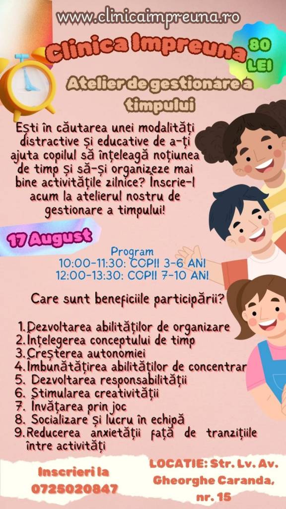 – Atelier de gestionare a timpului, la Clinica Împreună (zona Orizont), 17 august, orele 10 (3-6 ani) și 12 (7-10 ani), 80 lei/copil