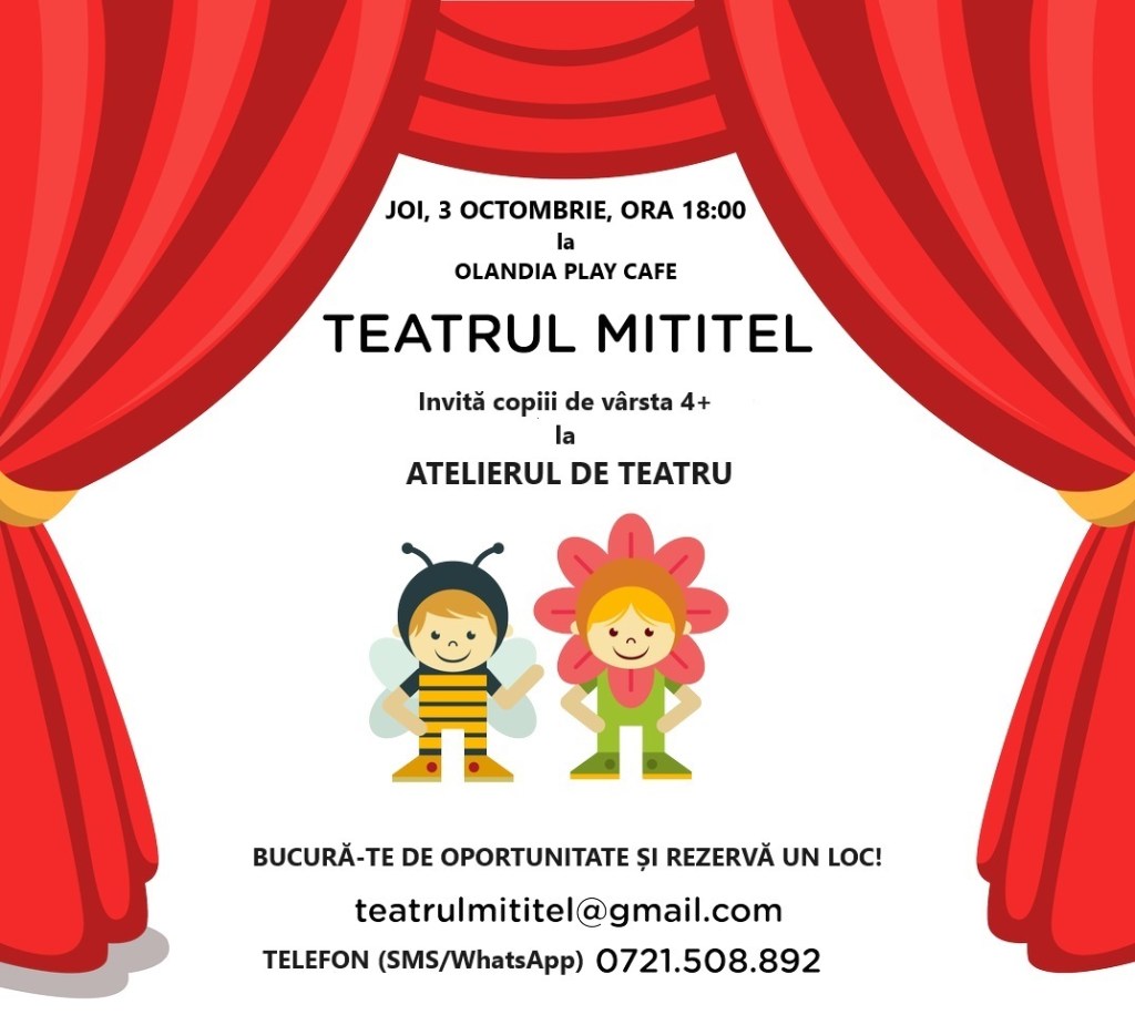 – Atelier de teatru cu Teatrul Mititel, la Olandia Play Cafe (zona Tineretului), 17 octombrie, ora 18, 4-6 ani, 90 lei/copil