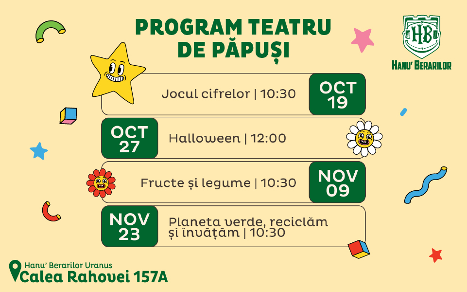 – Teatru de Păpuși: Jocul cifrelor, la Hanu’ Berarilor, 19 octombrie, ora 10:30, 35 lei/copil