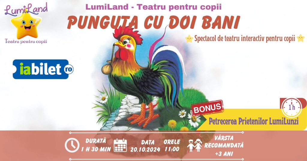 – Punguța cu doi bani – Spectacol de teatru interactiv pentru copii, la Teatrul Lumiland, 20 octombrie, ora 11, 3 ani+, 60 lei/copil și 35 lei/adult