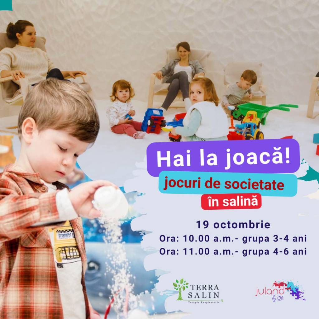 – Atelier de joacă și boardgame-uri, la Terra Salin Parcul Carol, 19 octombrie, orele 10 (3-4 ani) și 11 (4-6 ani), inclus în sesiunea de haloterapie
