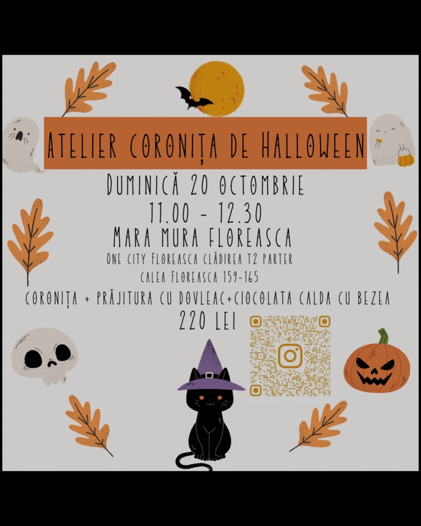 – Atelier Coronița de Halloween, la MaraMura Floreasca, 20 octombrie, ora 11, 220 lei/copil (coroniță, prăjitură și băutură)