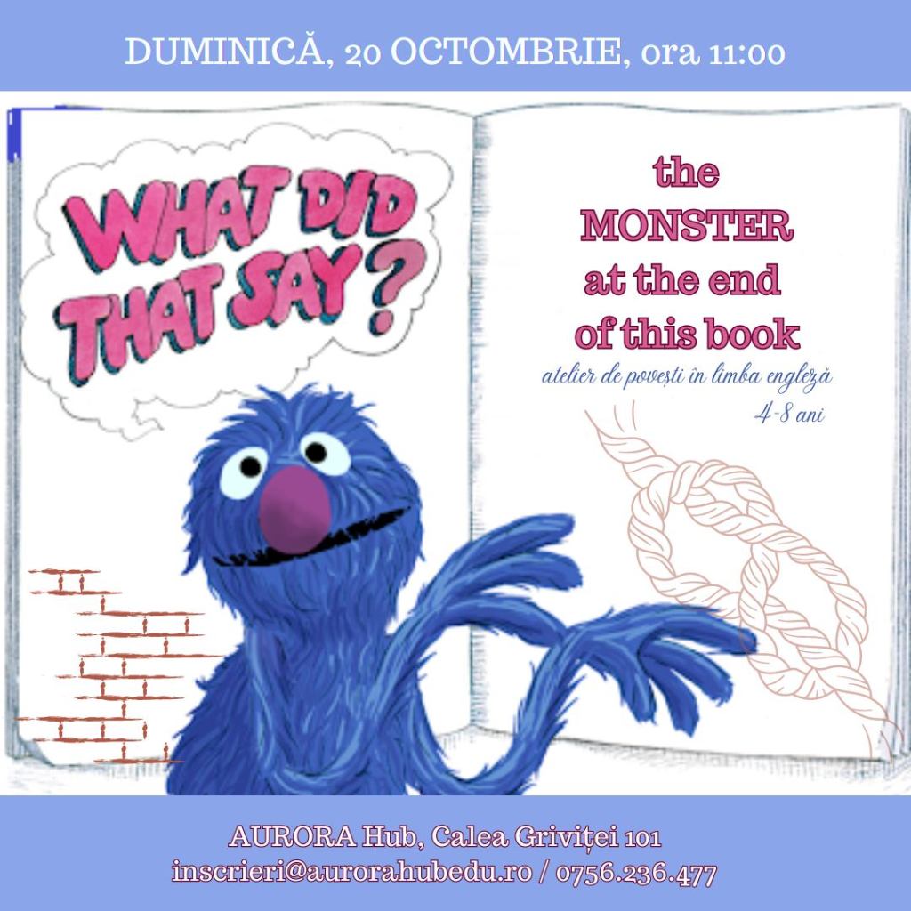 – Atelier de povești în limba engleză – „The monster at the end of this book“, la Aurora Hub (zona Victoriei), 20 octombrie, ora 11, 4-8 ani, 70 lei/copil – 20% reducere dacă spui #stiudelasorina