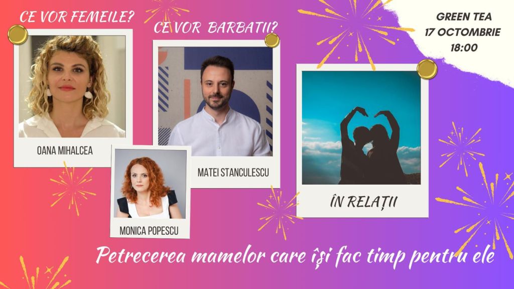 – Petrecerea mamelor care își fac timp pentru ele – Ce vor femeile? Ce vor bărbații? În relații, la Ceainăria GreenTea, 17 octombrie, ora 18, 50 lei/persoană