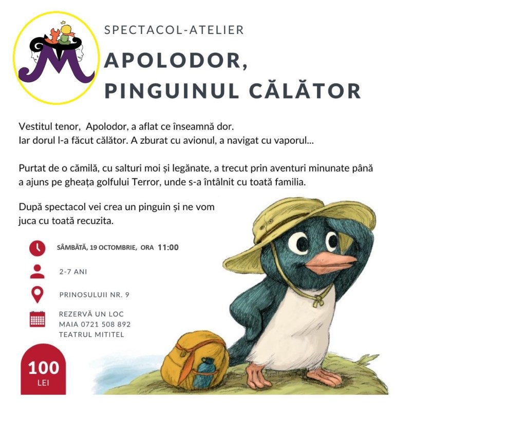 – Apolodor, pinguinul călător – spectacol-atelier cu Teatrul Mititel, la ToniBoni (zona Piaţa Sudului), 19 octombrie, ora 11, 2-7 ani, 100 lei/copil+părinte