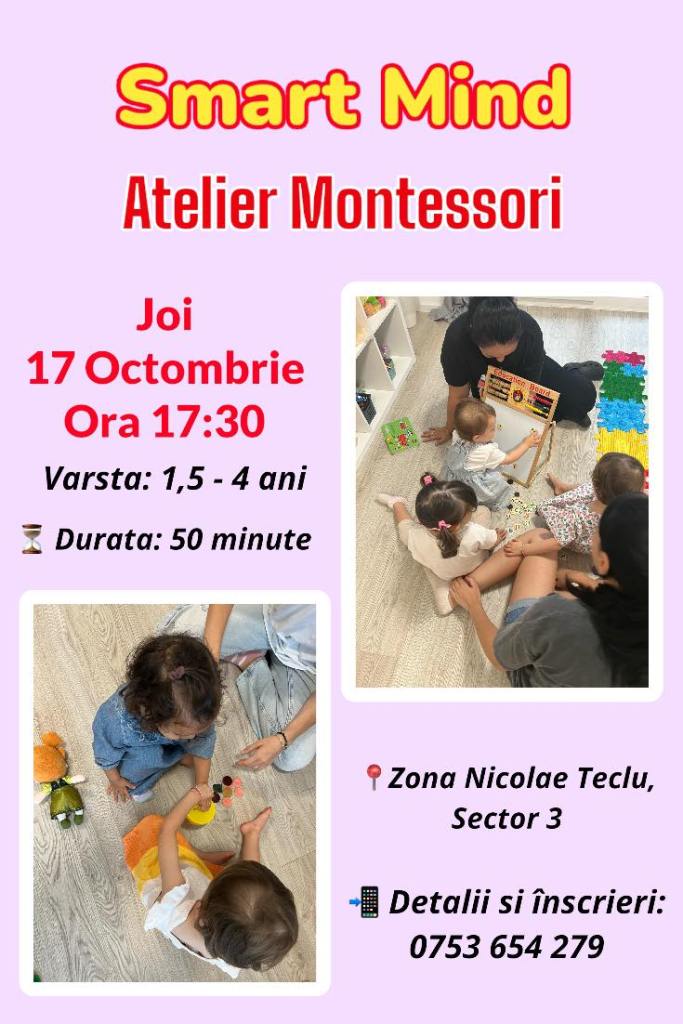 – Atelier Montessori, la Smart Mind (zona Nicolae Teclu), 17 octombrie, ora 17:30, 1,5-4 ani, 120 lei/copil
