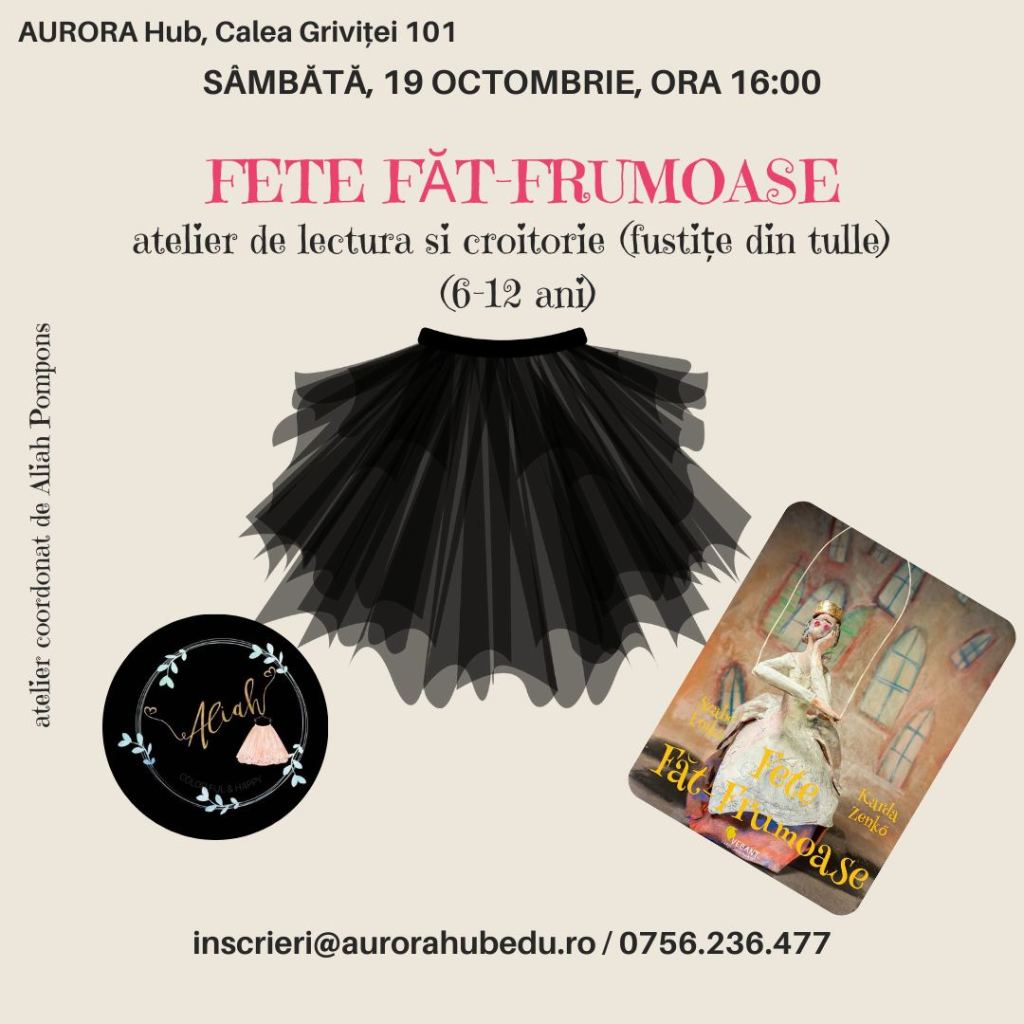 – Fete Făt-Frumoase – atelier de lectură și croitorie (fustițe din tulle), la Aurora Hub (zona Victoriei), 19 octombrie, ora 16, 6-12 ani, 100 lei/copil – 20% reducere dacă spui #stiudelasorina