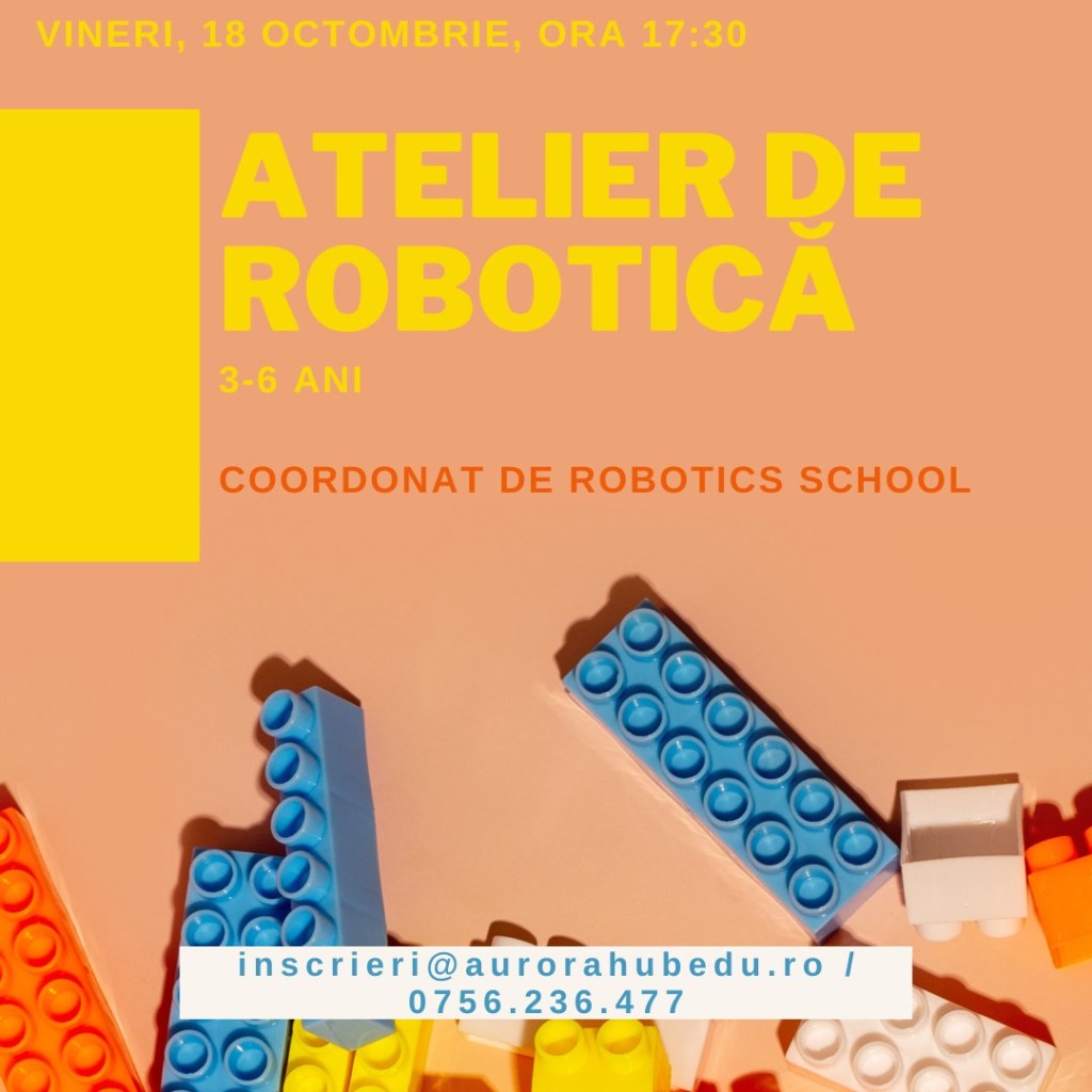 – Atelier de robotică – construcție robot, comenzi pe tabletă, la Aurora Hub (zona Victoriei), 18 octombrie, ora 18:30, 6-12 ani, 80 lei/copil – 20% reducere dacă spui #stiudelasorina