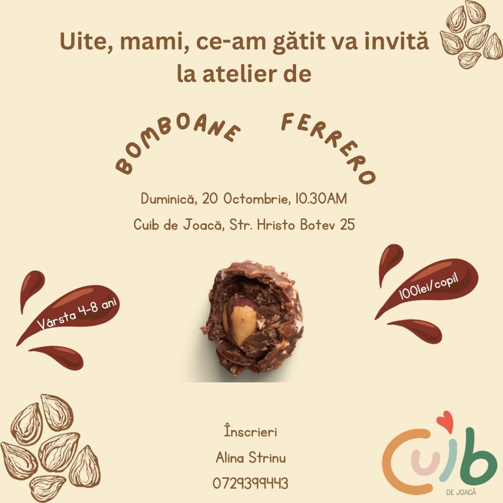 – Uite, mami, ce-am gătit: Bomboane Ferrero, la Cuib de Joacă (zona Unirii), 20 octombrie, ora 10:30, 4-8 ani, 100 lei/copil