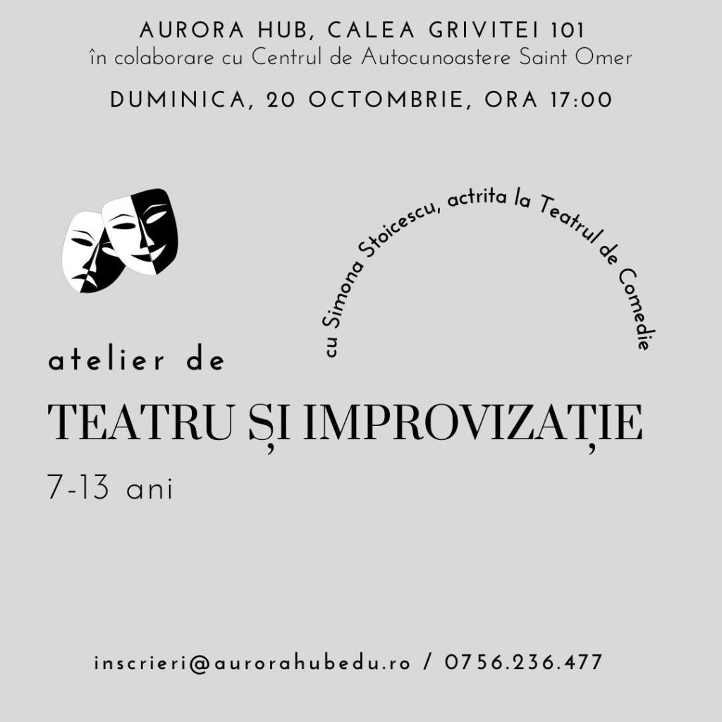 – Atelier de teatru și improvizație, la Aurora Hub (zona Victoriei), 20 octombrie, ora 17, 7-13 ani, 75 lei/copil – 20% reducere dacă spui #stiudelasorina