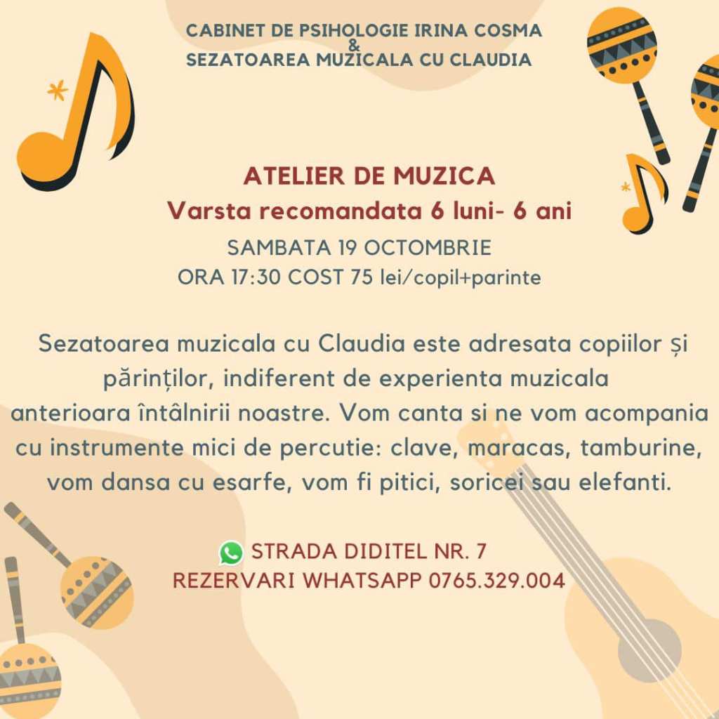 – Șezătoare muzicală cu Claudia, la Cabinet Individual de Psihologie Irina Cosma (zona Tineretului), 19 octombrie, ora 17:30, 6 luni – 6 ani