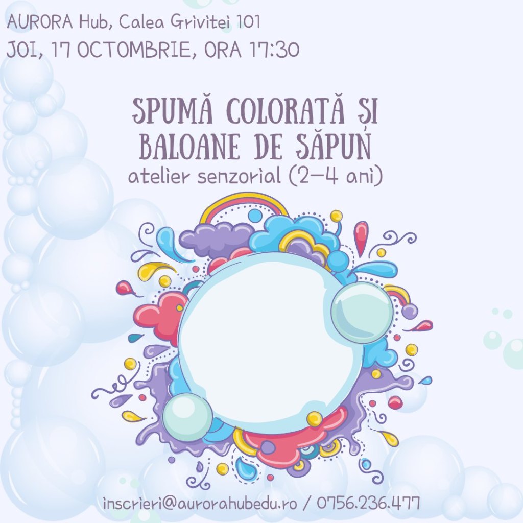 – Spumă colorată și baloane de săpun – atelier senzorial, la Aurora Hub (zona Victoriei), 17 octombrie, ora 17:30, 2-4 ani, 90 lei/copil – 20% reducere dacă spui #stiudelasorina