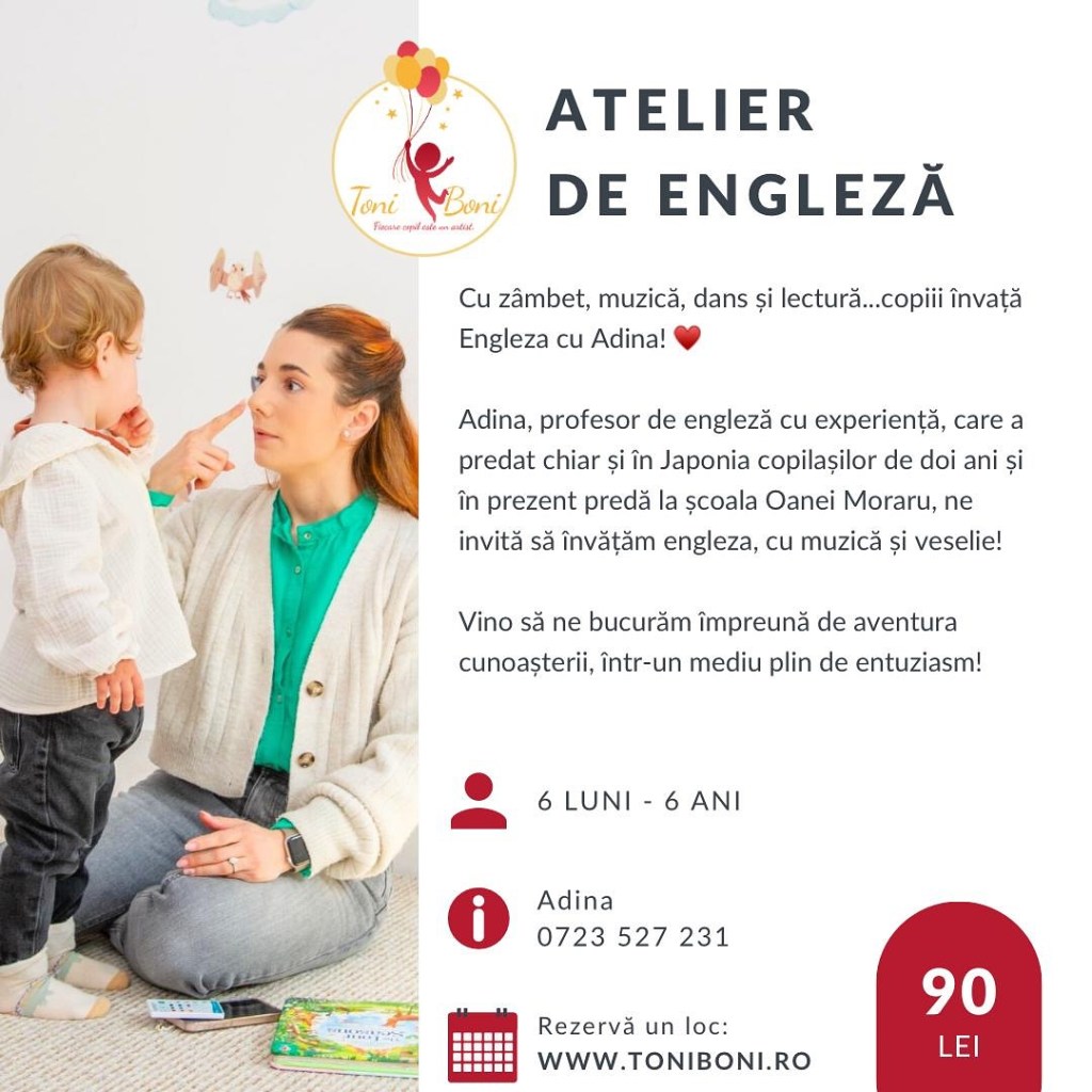 – Atelier de engleză, la ToniBoni (zona Piaţa Sudului), 19 octombrie, ora 11, 6 luni-6 ani, 90 lei/copil