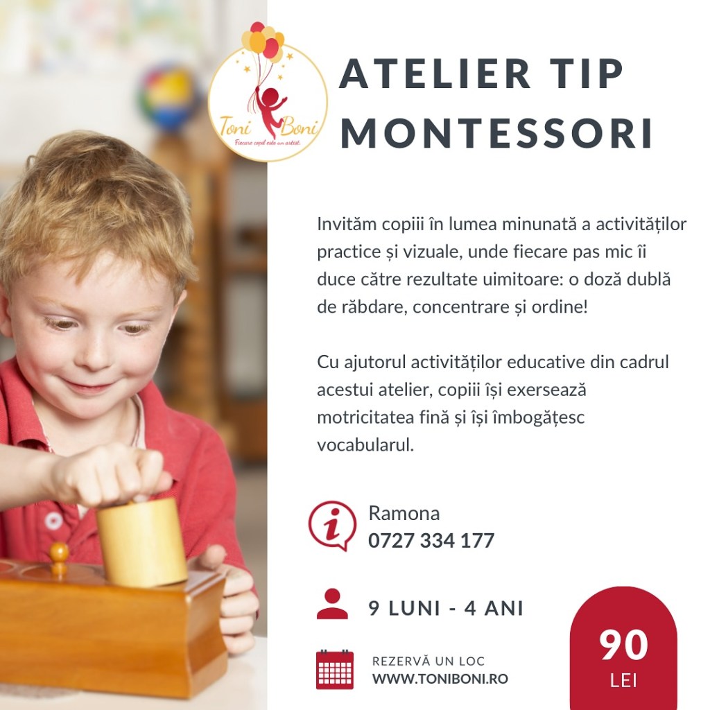 – Atelier tip Montessori, la ToniBoni (zona Piaţa Sudului), 18 octombrie, ora 18, 9 luni-4 ani, 90 lei/copil
