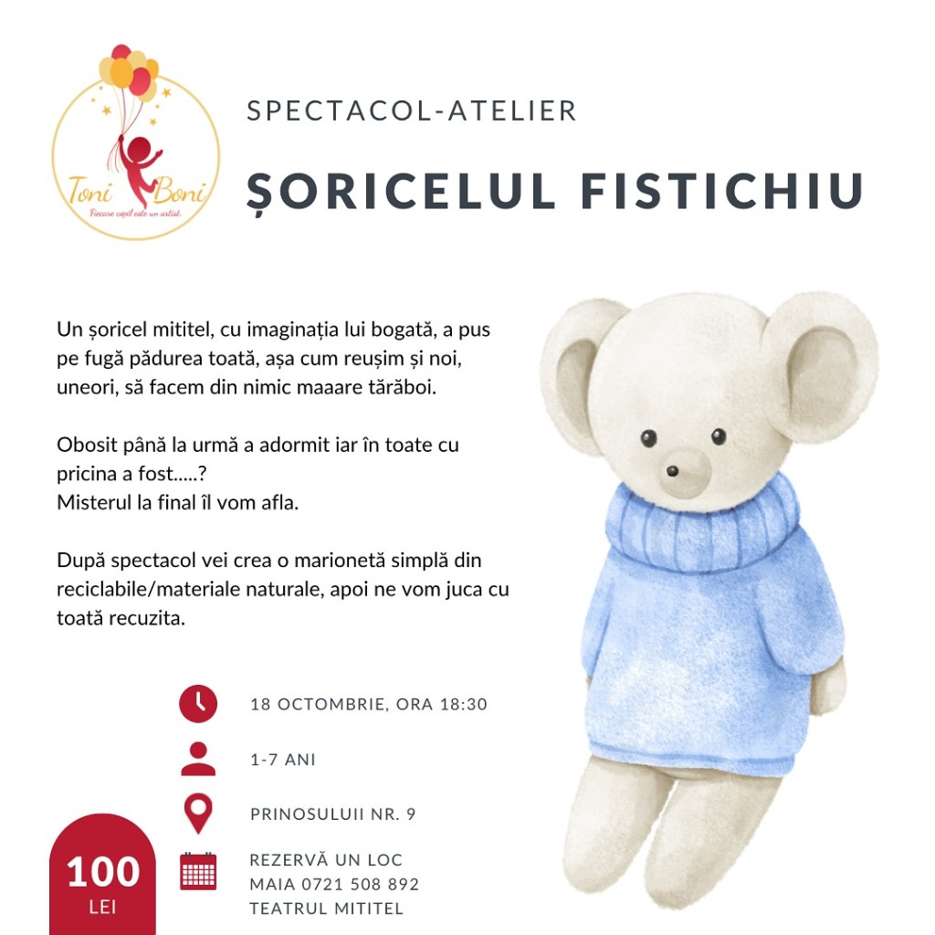 – Șoricelul fistichiu – spectacol-atelier cu Teatrul Mititel, la ToniBoni (zona Piaţa Sudului), 18 octombrie, ora 18:30, 1-7 ani, 100 lei/copil+părinte
