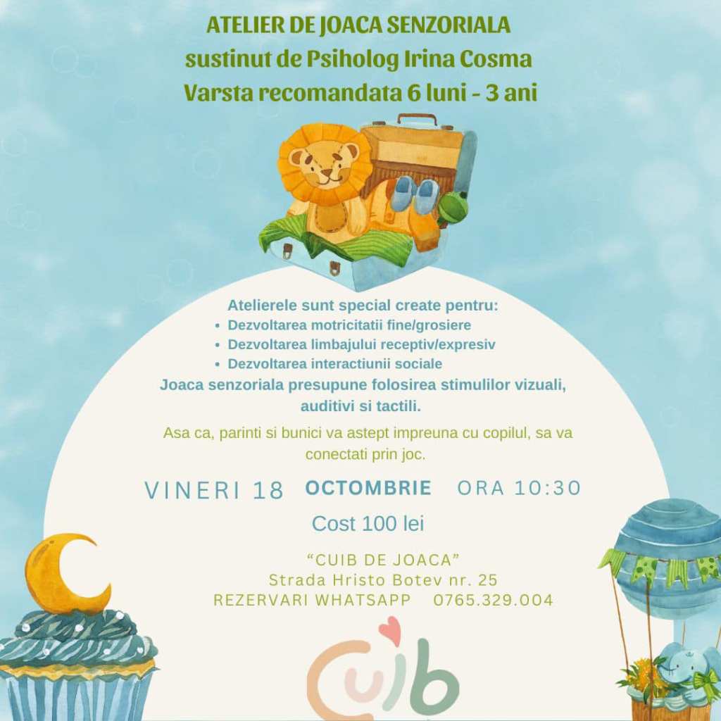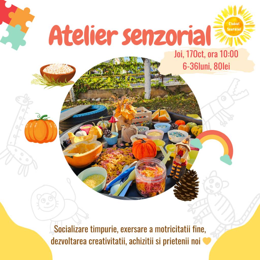 – Atelier senzorial, la Clubul Soarelui Chiajna, 17 octombrie, ora 10, 6 luni – 3 ani, 80 lei/copil