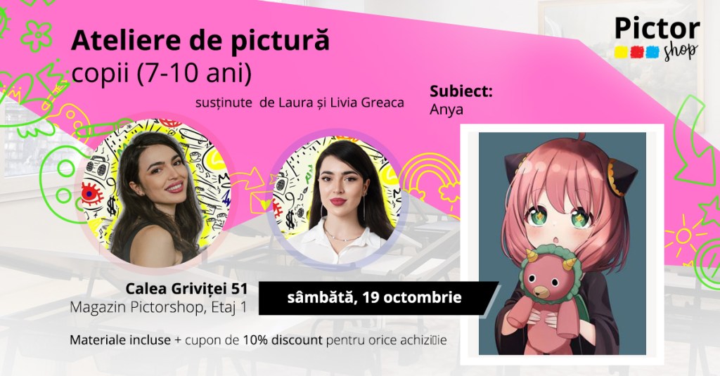– Atelier de desen și pictură, la PictorShop, 19 octombrie, orele 10 (7-10 ani) și 12 (11-14 ani), 150 lei/copil