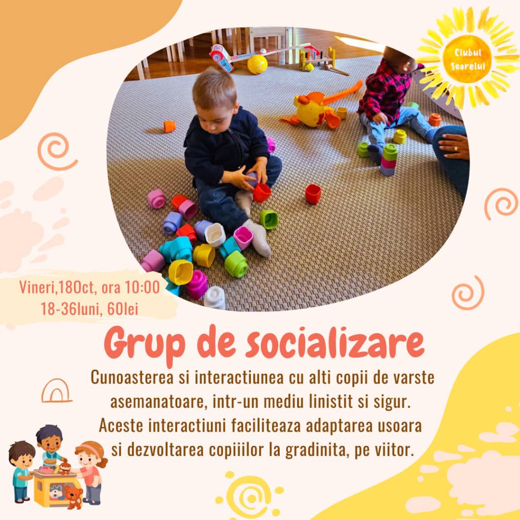 – Grup de socializare, în pregătire pentru grădiniță, la Clubul Soarelui Chiajna, 18 octombrie, ora 10, 1,5-3 ani, 60 lei/copil