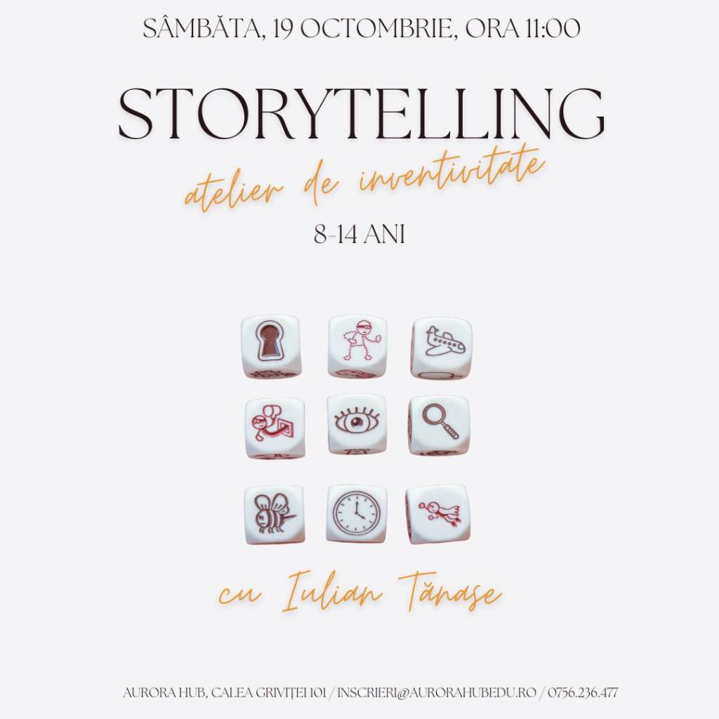– Storytelling cu Iulian Tănase – ateliere de inventivitate, la Aurora Hub (zona Victoriei), 19 octombrie, ora 11, 8-14 ani, 150 lei/copil – 20% reducere dacă spui #stiudelasorina