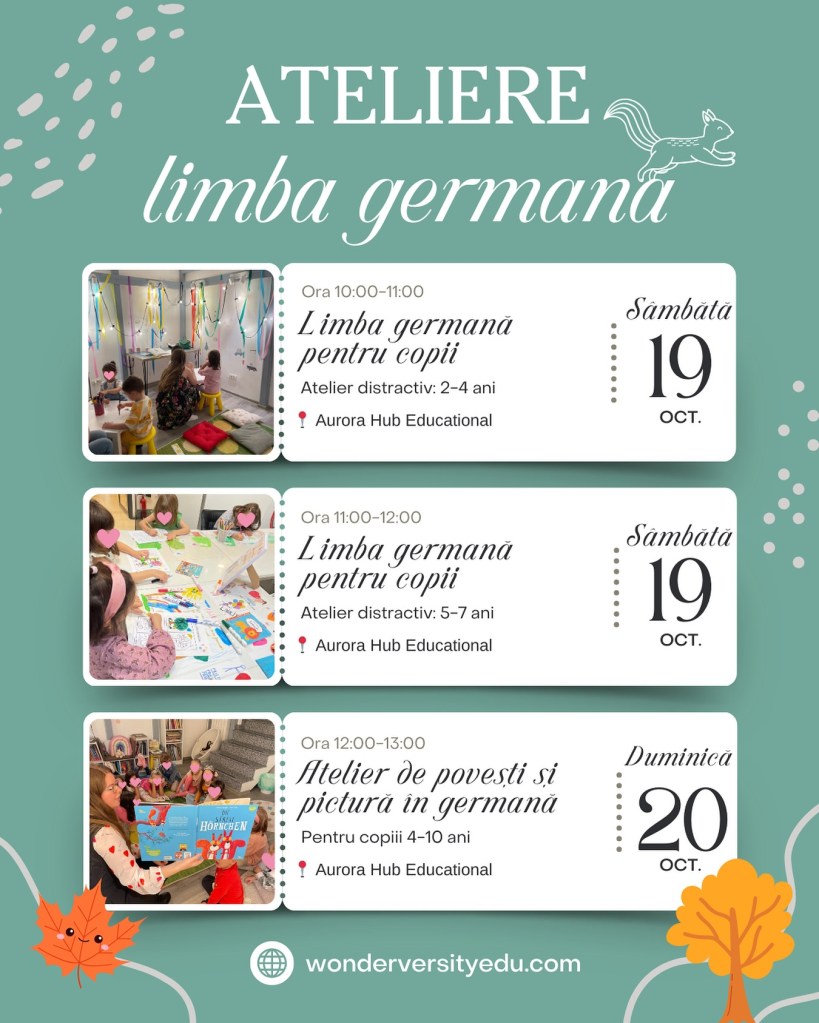 – Atelier distractiv de limba germană, cu Wonderversity, la Aurora Hub (zona Victoriei), 19 octombrie, orele 10 (2-4 ani) și 11 (5-7 ani), 70 lei/copil – 10% reducere dacă spui #stiudelasorina