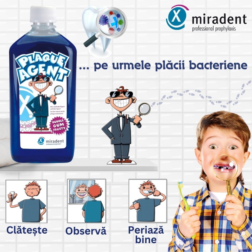 Iar vorbind de Halloween și dulciuri, voi știați de Plaque Agent? Pentru că o dată ce ajungi s-o folosești, te cam ia groaza! Chiar dacă periajul pare făcut corespunzător, unele zone pot fi ratate. Iar problema e că placa dentară favorizează apariția cariilor și problemelor gingivale și este un indicator care arată că cei mici nu au o igienă orală corespunzătoare. Plaque Agent este o soluție colorată de clătire a gurii care îi ajută pe copii să vadă cu ochii lor, într-un mod distractiv, depunerile de placă bacteriană de pe dințișori. Adică pot verifica singuri dacă se spală bine pe dințișori. Folosită înainte de periaj, soluția colorează în albastru depunerile de placă, iar petele colorate pot fi apoi îndepărtate prin periere țintită. Cu un gust grozav de gumă de mestecat de fructe, acest produs îi ajută pe cei mici să înțeleagă nevoia unei îngrijiri dentare zilnice amănunțite. E potrivită pentru copiii cu vârsta de peste 6 ani și o găsiți la BebeTei.