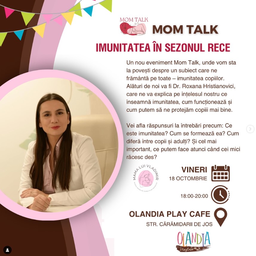 – Mom Talk: Imunitatea în sezonul rece, la Olandia Play Cafe (zona Tineretului), 18 octombrie, ora 18