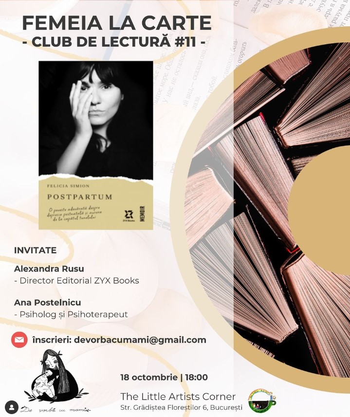 – Femeia la carte – Club de lectură: “Postpartum” de Felicia Simion, la The Little Artists Corner (zona Floreasca), 18 octombrie, ora 18