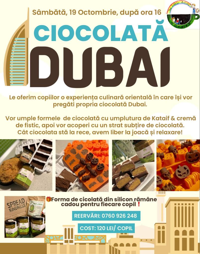 – Atelier de gătit Ciocolată Dubai, la The Little Artists Corner (zona Floreasca), 19 octombrie, ora 16, 120 lei/copil